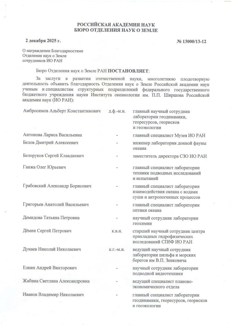 За заслуги в развитии отечественной науки, многолетнюю плодотворную деятельность объявить благодарность Отделения наук о Земле Российской академии наук ученым и специалистам структурных подразделений федерального государственного бюджетного учреждения науки Института океанологии им. П.П. Ширшова Российской академии наук (ИО РАН):