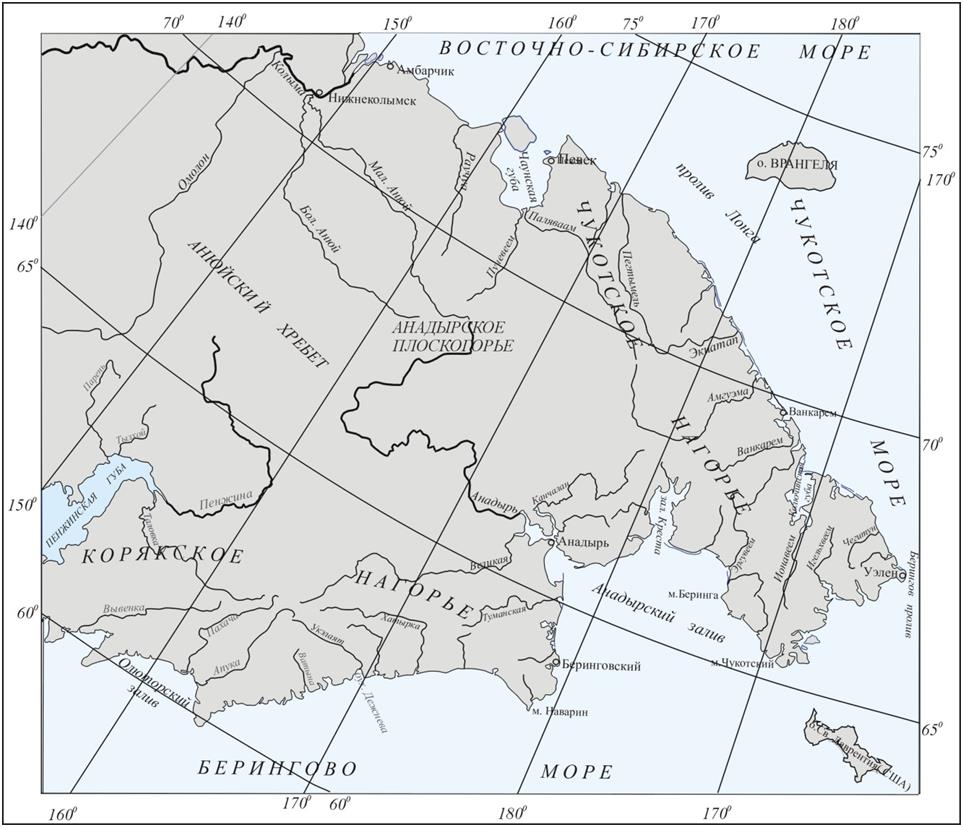 При составлении атласа под Чукоткой понималась часть территории Российской Федерации, входящая в Чукотский автономный округ общей площадью 721,5 тыс. км2 и расположенная на крайнем северо-востоке России. Граничит с Якутией (Саха) на северо-западе (от мыса Медвежий на побережье Восточно-Сибирского моря вдоль правобережья Нижней Колымы и Омолона), Магаданской областью на юго-западе (в районе хребта Уш-Урэкчэн) и бывшим Корякским округом Камчатского края на юге (в районе хребтов Ичигемский, Пенжинский и Пикась). Омывается Восточно-Сибирским и Чукотским морями Северного Ледовитого океана и Беринговым морем Тихого океана. Крайняя северо-восточная часть Чукотки между Чукотским морем, проливом Беринга и Анадырским заливом носит название Чукотского полуострова.