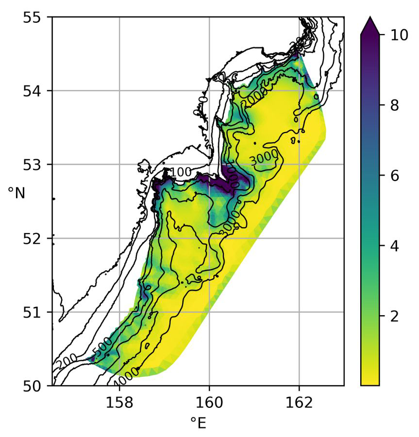 Команда ученых из Института океанологии им. П.П. Ширшова РАН и Камчатского филиала ВНИРО обнаружила, что для точного прогноза численности главной промысловой рыбы России — минтая — необходимо учитывать влияние приливов. Исследования проводились в Тихом океане у берегов полуострова Камчатка и северных Курильских островов, где на шельфе и в глубоководных каньонах находятся основные районы икрометания восточнокамчатской популяций минтая.