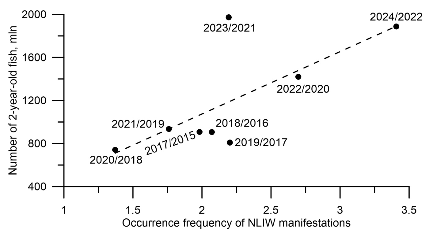 Ученые установили стабильность районов проявления короткопериодных внутренних волн, что подтверждает выдвинутую ранее гипотезу их приливного происхождения. По их данным, внутренние волны оказывают воздействия на процессы вертикального перемешивания воды. Это способствует изменению концентрации питательных веществ и распределению планктонных организмов, что, в свою очередь, влияет на доступность пищи для личинок рыб и их выживаемость. Исследование выполнялось по проекту Российского научного фонда.