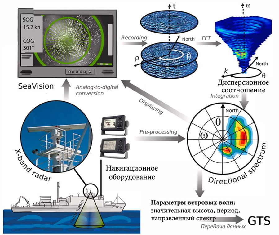 Схема работы системы SeaVision. Сигнал с поверхности моря (зёленый) оцифровывается с помощью аналого-цифрового преобразователя и преобразуется во временной ряд радиолокационных изображений. Алгоритм восстановления с использованием быстрого преобразования Фурье (БПФ) преобразует эти временные ряды в трёхмерный спектр, на котором обнаруживается дисперсионная оболочка. Затем он преобразуется в направленный волновой спектр. Окончательный набор параметров, включая высоту волны, периоды и направления, направленный спектр D(ω, θ) для заданных частот ω и направлений θ, передается через GTS (Global Telecommunication System)