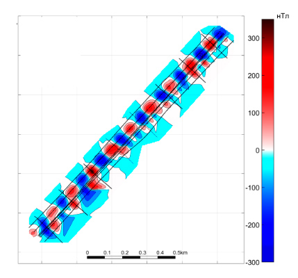 - Поиск техногенных металлических объектов с определением их пространственного положения (координат и глубины залегания), формы и массы.