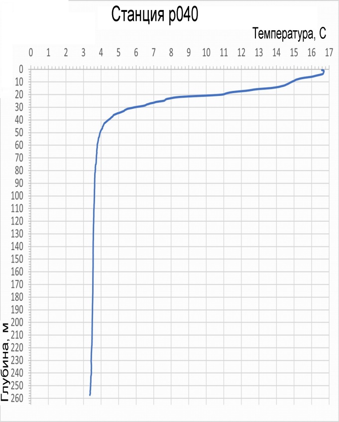 Вертикальный профиль температуры воды на станции р040 (у пос. Яйлю) в акватории оз. Телецкого