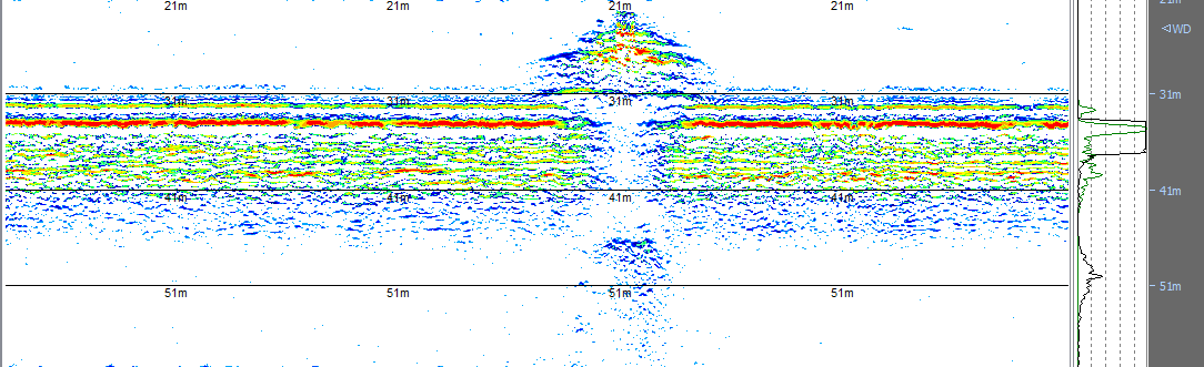 Помимо радиационных исследований в заливе Степового было выполнено зондирование донных осадков на маршрутах вдоль всего залива с использованием судового акустического профилографа SES. Параллельно производилось зондирование водной толщи с помощью судового ADCP. На рисунке приведен пример записи полученной с помощью SES, на которой изображен разрез осадочных отложений в районе затопления АПЛ К-27. На изображении четко прослеживается нижняя граница (оранжевая толстая линия) слоя неконсолидированного водонасыщенного илистого грунта мощностью 2-3 м с включениями (галькой) от ледового разноса и плотных литифицированных глинистых пород. Ниже залегают коренные сланцы. Полученные данные позволят исследовать параметры переноса донных осадков и водных масс вдоль залива и их вынос в открытое море, что является важной информацией для оценки возможных последствий распространения радионуклидов при нарушении защитных барьеров АПЛ К-27 (например, в результате СЦР). Предварительные результаты свидетельствуют о приливно-отливной и волновой природе переноса водных масс в заливе. Это же подтверждают измерения гидрофизической структуры водной толщи, измерения которой велось непрерывно на всех станциях, равно как и отбор проб донных осадков и придонной воды. В настоящее время радиационная обстановка в заливе не внушает опасений.