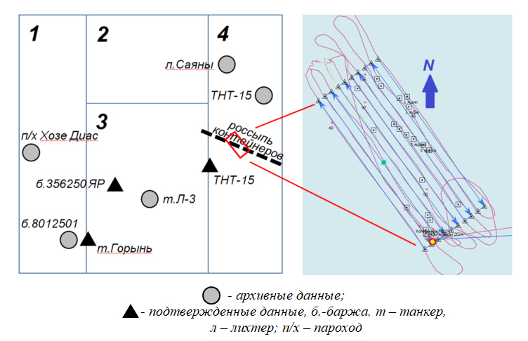 На третьем этапе работ по программе «Научно-технологическое обеспечение реабилитации арктического региона от затопленных и затонувших объектов с отработавшим ядерным топливом и радиоактивными отходами (РАО)» экспедиция НИС ПС «Академик Иоффе» выполнила комплексные исследования состояния окружающей среды и подводных объектов в Новоземельской впадине в Карском море, где в 1967-91 годах производились захоронения РАО, в виде затопления судов (12 единиц) с грузом радиоактивных отходов, контейнеров (4834 ед.) и отдельных агрегатов (306 ед.). Только для части из этих объектов удалось подтвердить факт затопления и исследовать состояние, поскольку места затопления по архивным данным и фактическое нахождение объектов не совпадают. Ситуация с расположением элементов захоронения продемонстрирована на рисунке схемой полигона «Впадина-Юг».