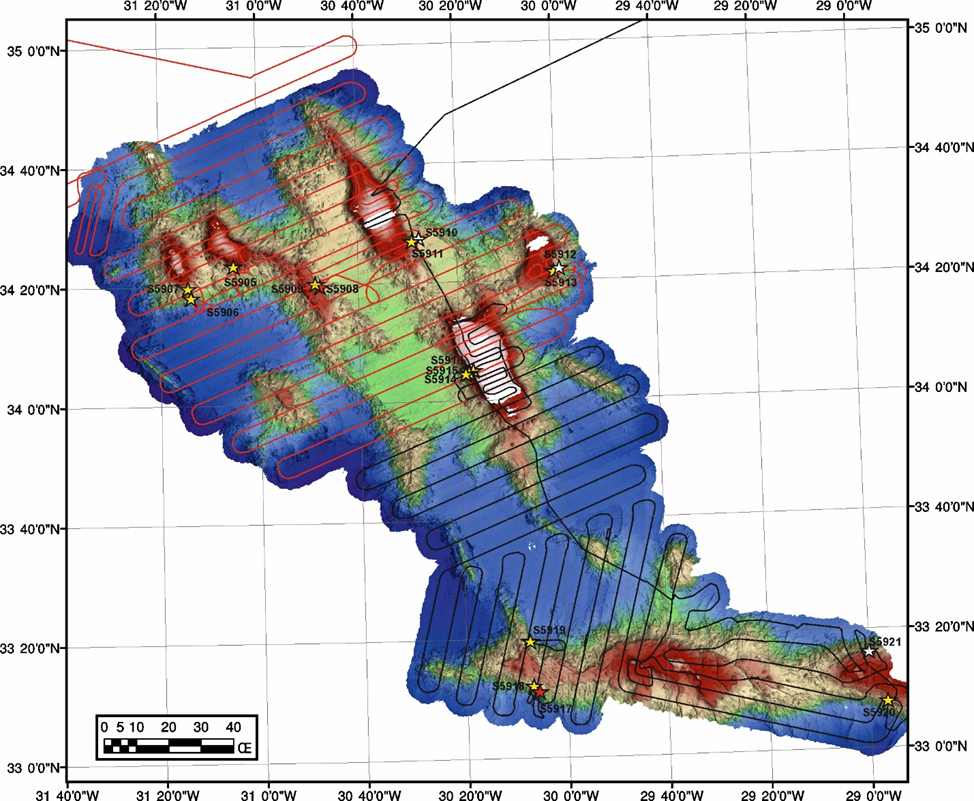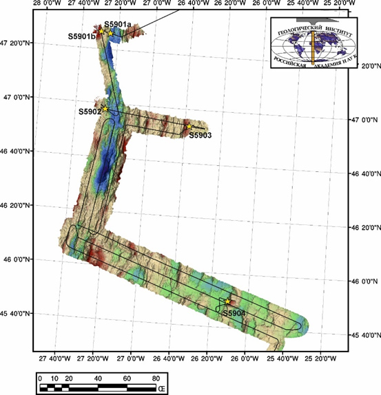 - С помощью судового многолучевого глубоководного эхолота SeaBat 7150 – 12 кГц (фирмы RESON) осуществлена батиметрическая съемка осевой зоны САХ, находящейся на продолжении трога Кинг по его простиранию, и области, заключенной между этой частью осевой зоны САХ и трогом Кинг, а также северо-западной ветви гор Грейт Метеор – Атлантис, по результатам которых построены батиметрические карты среднего масштаба (1 : 100 000) площадью 8400 км2 и 25000 км2, соответственно. Анализ этих карт позволит провести тектоническое районирование изученных площадей с выходом на природу и последовательность внутриплитных тектонических и вулканических процессов, действовавших в ходе образования и последующей эволюции трога Кинг и системы гор Грейт Метеор – Атлантис.